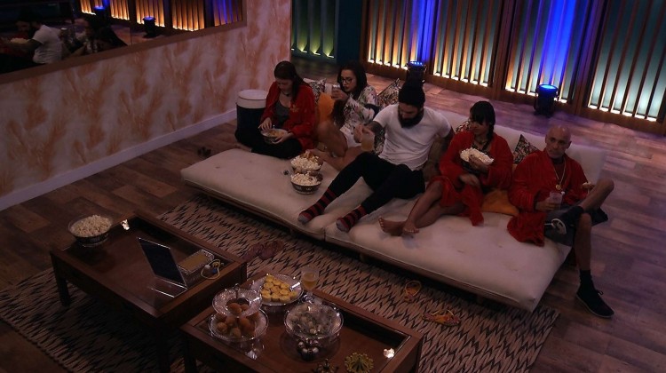 Após fazerem a festa com as comidinhas disponíveis no segundo andar da casa, família Lima, Gleici, Paula e Wagner sentam no sofá para assistirem ao filme do Cinema do Líder. Com exceção de Ayrton, os brothers assistem o filme com um balde de pipoca no colo.