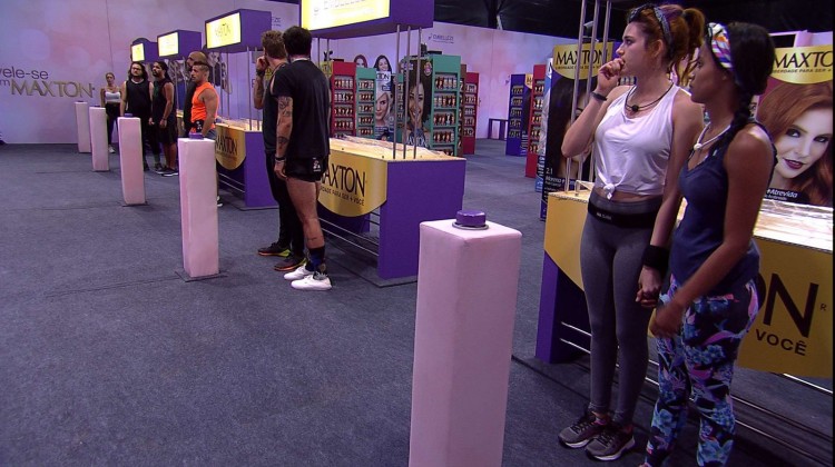 Eles se dividiram em duplas e tiveram que atravessar obstáculos para montar um painel com embalagens da tintura Maxton, da Embelleze. Confira as regras.