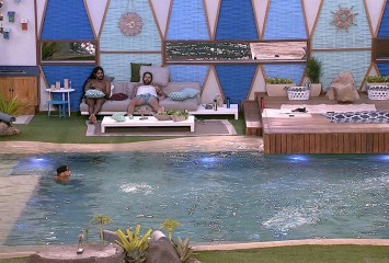 Na área externa, Diego e Kaysar tomam banho de piscina. Caruso e Viegas especulam sobre o Jogo da D...