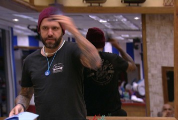 Enquanto Caruso corta seu cabelo, Kaysar corta seu próprio bigode com a tesoura. O sírio se olha ...